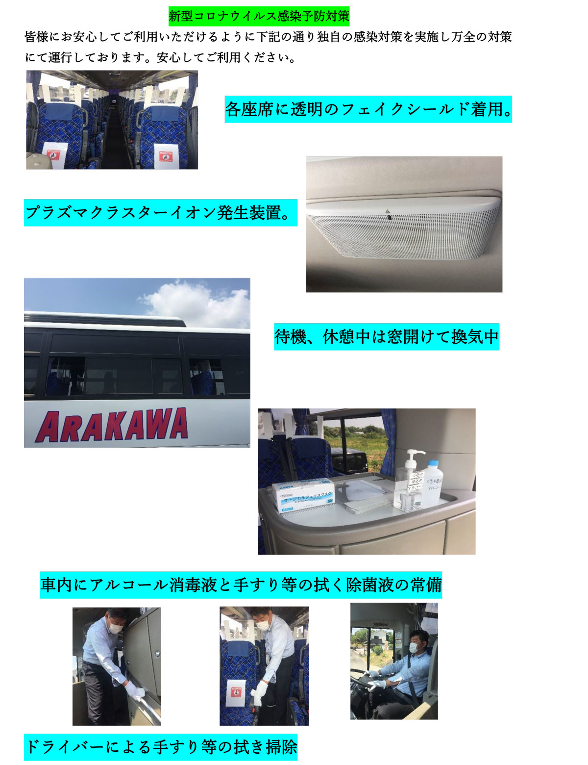 現在弊社の乗務員その他スタッフは新型コロナウイルス感染防止のため出勤時にアルコール除菌で手の消毒、検温、体調不良の確認、マスク着用をしております。